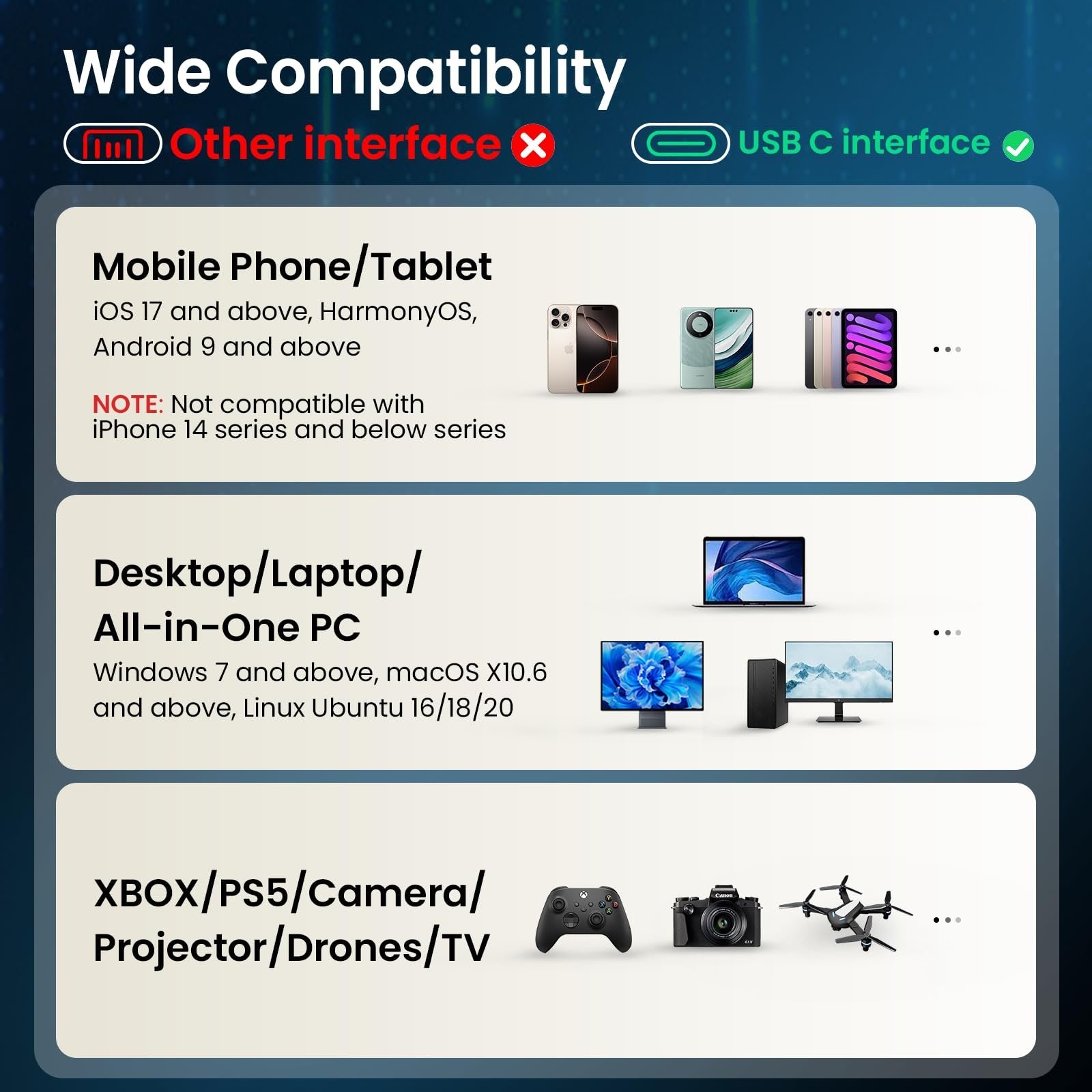 Wide Compatibility: This external SSD works seamlessly with laptops, smartphones, tablets, game consoles, and more using the USB Type-C connection. Its plug-and-play functionality means instant access for students, freelancers, and multitaskers on the go.(As long as it supports otg, Android phones can also be used, and it will be equipped with a magnetic attraction ring.)
