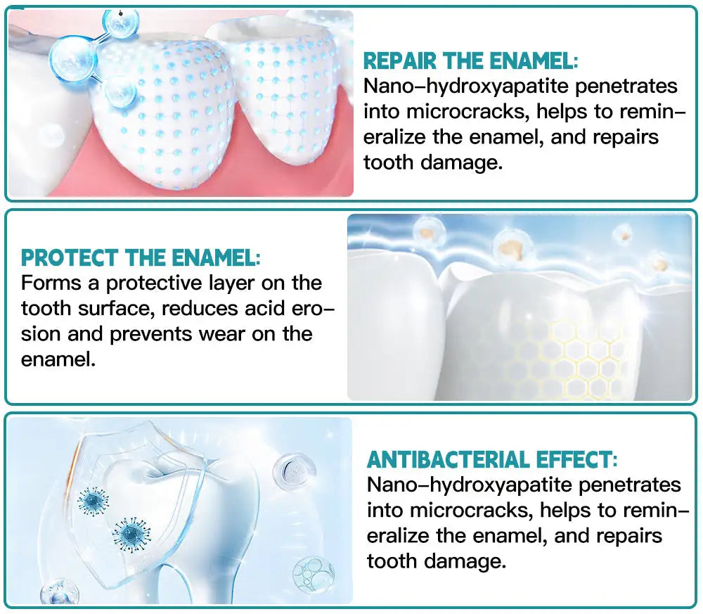 Nano-Hydroxyapatit: Nano-Hydroxyapatit ass e Mineral, deem seng Struktur dem Zännschmelz gläicht a effektiv d'Remineraliséierung an d'Reparatur vun den Zänn fördert. Et funktionéiert andeems et sech u Kalzium- a Phosphat-Ionen op der Zännuewerfläch bindt, wat d'Zänn stäerkt a Karies an Demineraliséierung verhënnert. D'Nanoskala-Partikelen penetréieren d'Zännuewerfläch a erméiglechen eng méi präzis an déif Reparatur, fërderen d'Regeneratioun vum Zännschmelz a reduzéieren d'Zännempfindlechkeet an d'Zerbriechlechkeet. Zousätzlech hëlleft Nano-Hydroxyapatit bei der Reparatur vu beschiedegten Zännuewerflächen, glättet kleng Rëss a Verschleiung aus, wat d'Zänn eng glat a gesond Uewerfläch gëtt. Ausserdeem verbessert et d'mëndlech Gesondheet andeems et d'Plackbildung reduzéiert, Zännstein verhënnert an de Risiko vu mëndleche Problemer reduzéiert.